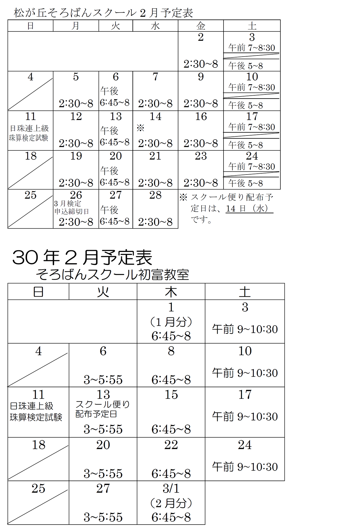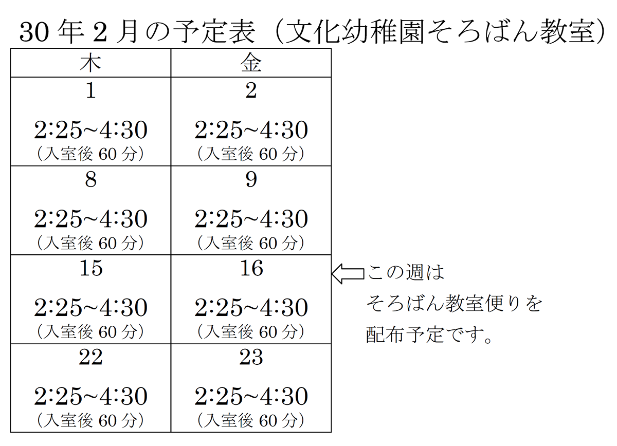今月の予定表 平成30年2月の予定表 保護者のみなさま、お間違えの無いようにご協力をよろしくお願いいたします。 2025年 2024年 2023年 2022年 2021年 2020年 2019年 2018年 2017年