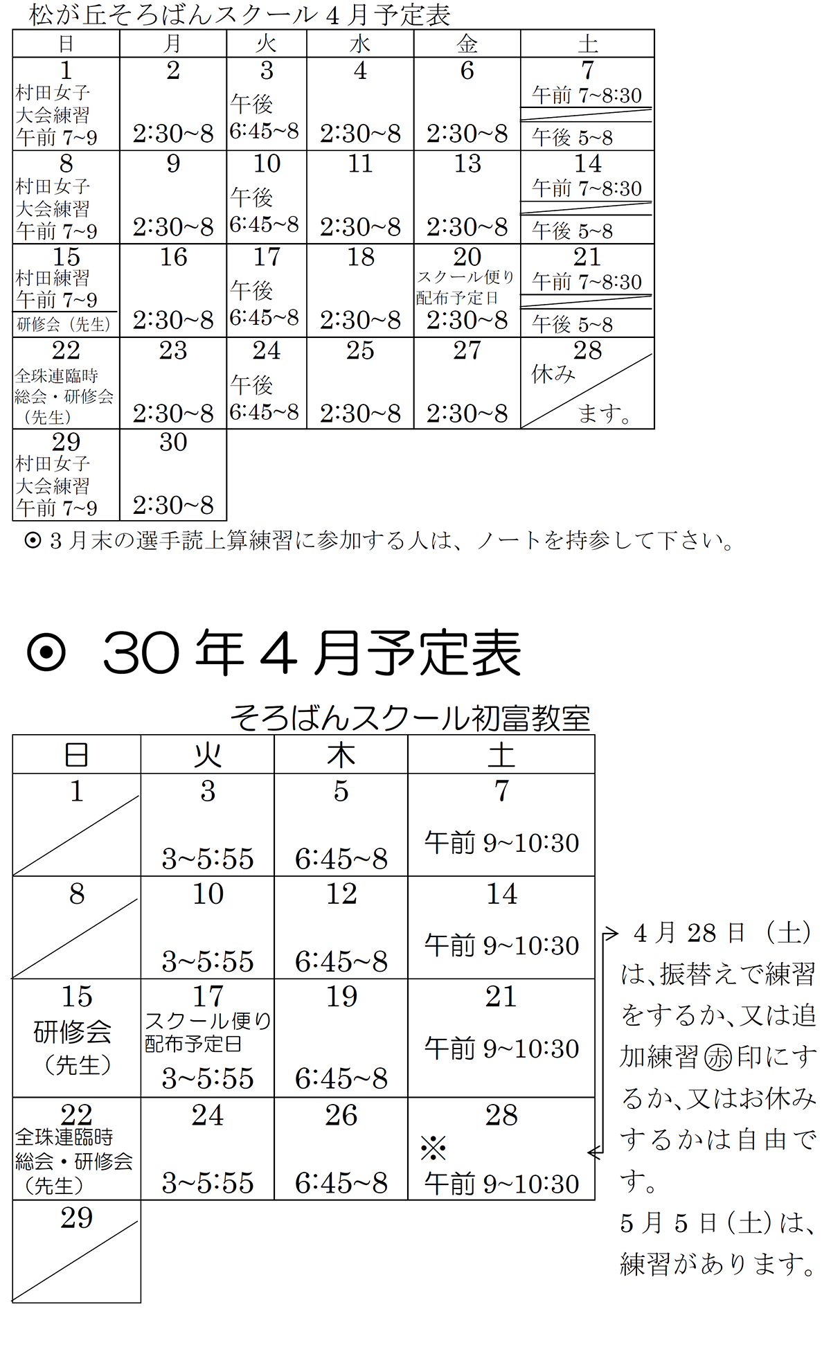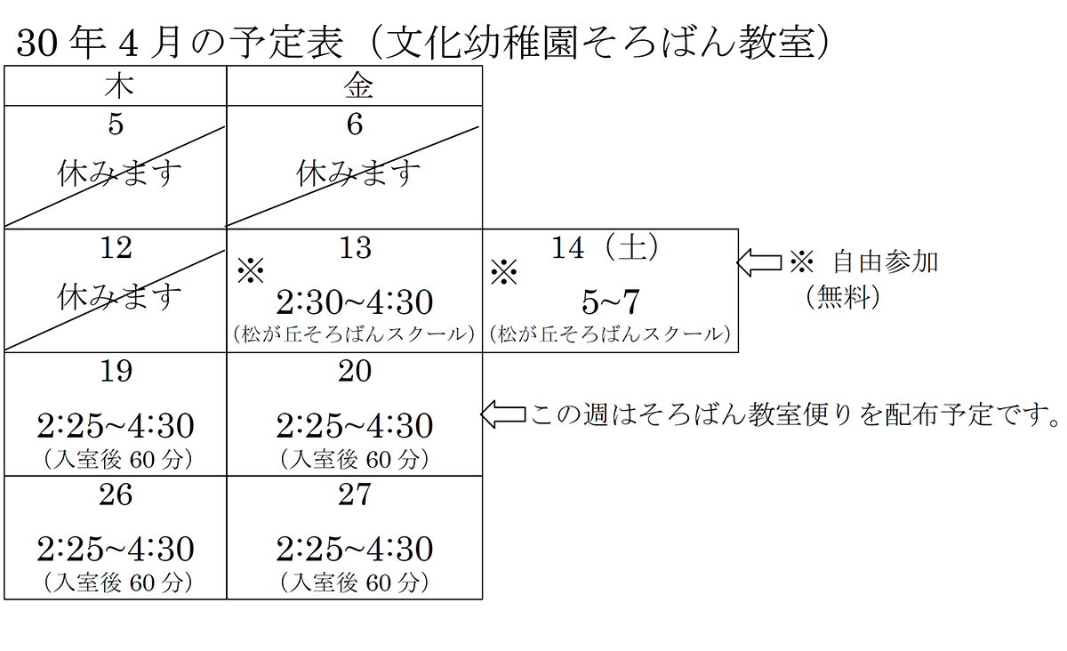 今月の予定表 平成30年4月の予定表 保護者のみなさま、お間違えの無いようにご協力をよろしくお願いいたします。 2025年 2024年 2023年 2022年 2021年 2020年 2019年 2018年 2017年