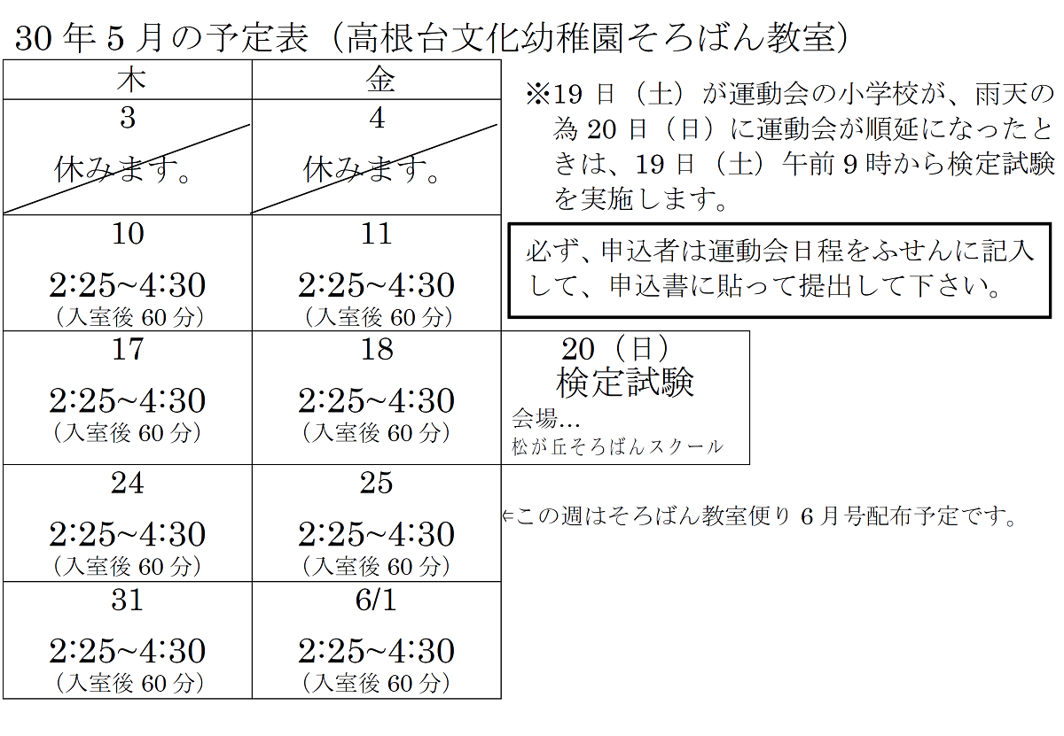 今月の予定表 平成30年5月の予定表 保護者のみなさま、お間違えの無いようにご協力をよろしくお願いいたします。 2025年 2024年 2023年 2022年 2021年 2020年 2019年 2018年 2017年