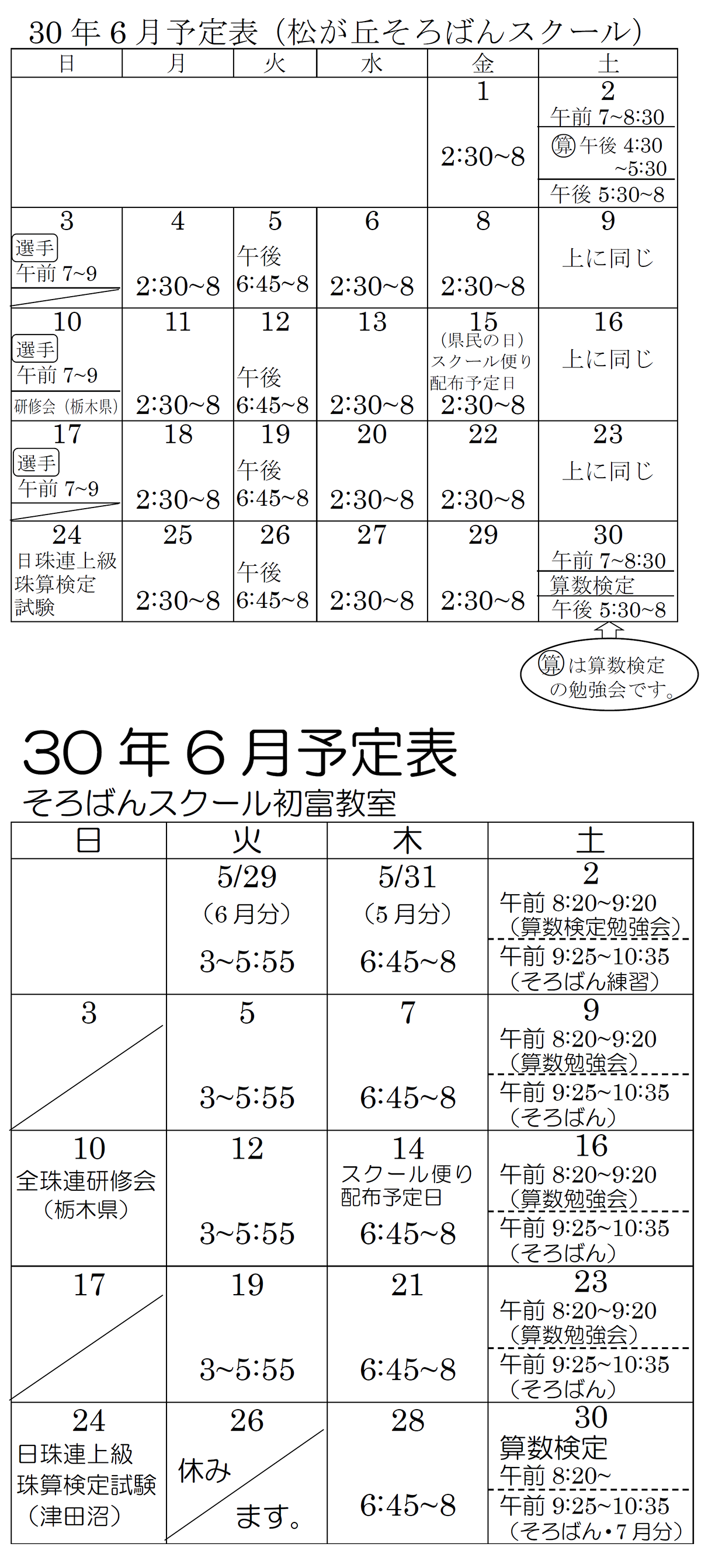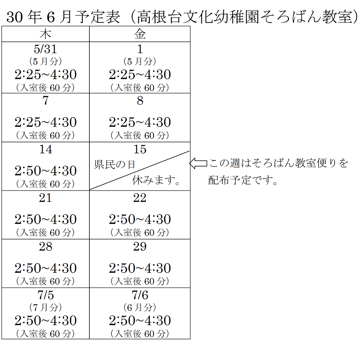 今月の予定表 平成30年6月の予定表 保護者のみなさま、お間違えの無いようにご協力をよろしくお願いいたします。 2025年 2024年 2023年 2022年 2021年 2020年 2019年 2018年 2017年
