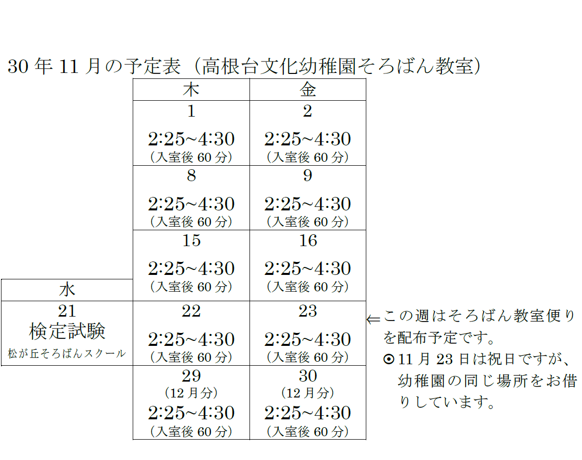今月の予定表 平成30年11月の予定表 保護者のみなさま、お間違えの無いようにご協力をよろしくお願いいたします。 2025年 2024年 2023年 2022年 2021年 2020年 2019年 2018年 2017年