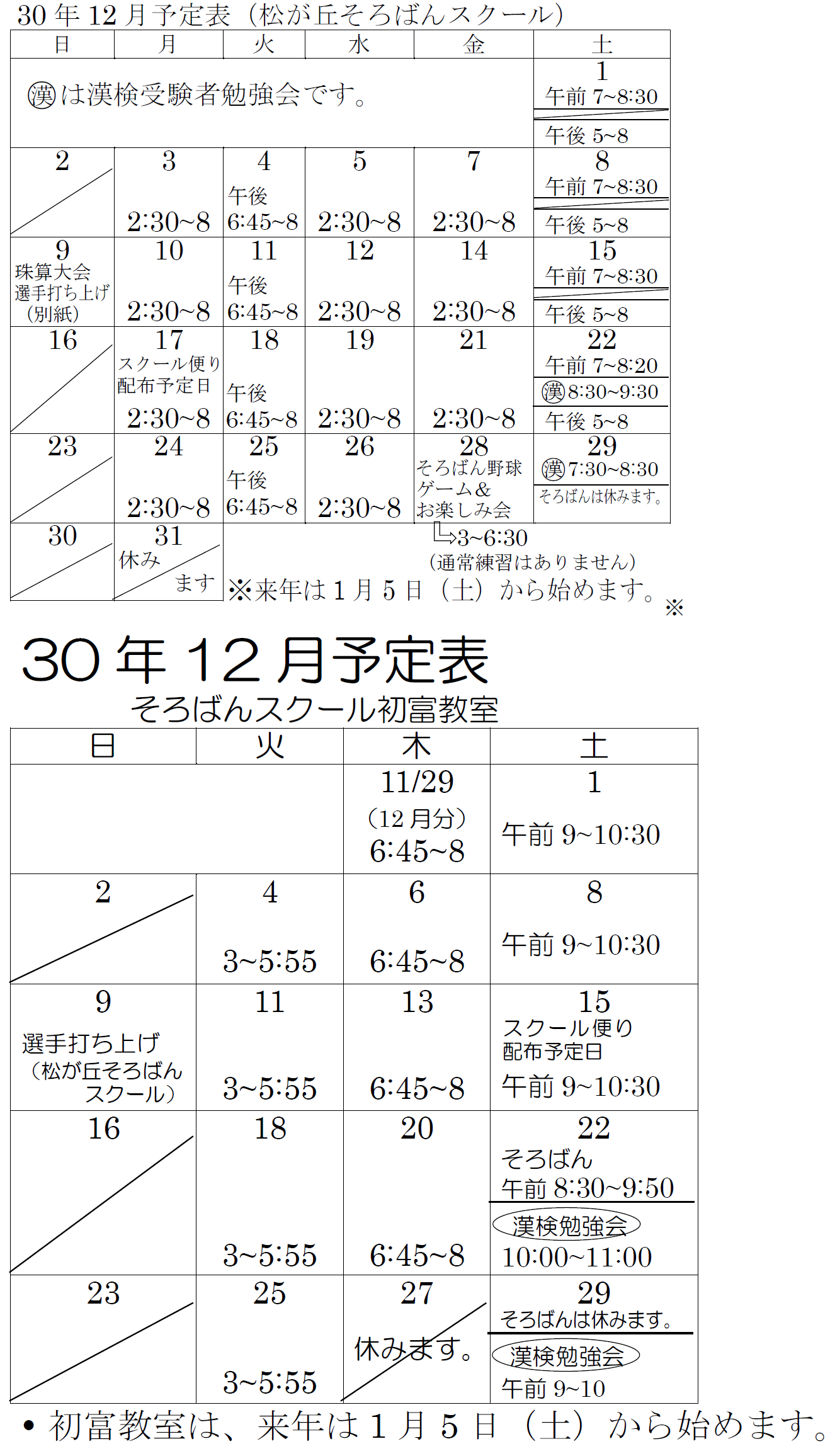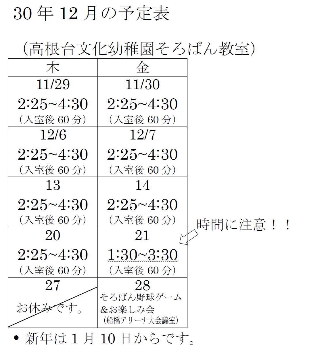 今月の予定表 平成30年12月の予定表 保護者のみなさま、お間違えの無いようにご協力をよろしくお願いいたします。 2025年 2024年 2023年 2022年 2021年 2020年 2019年 2018年 2017年