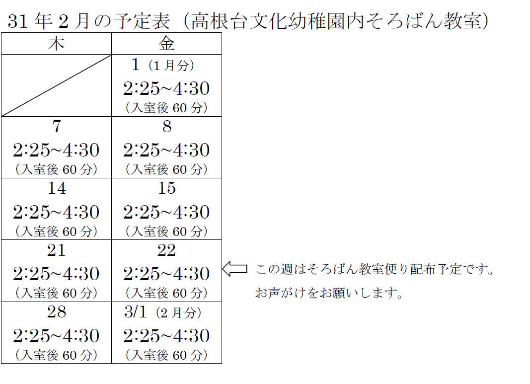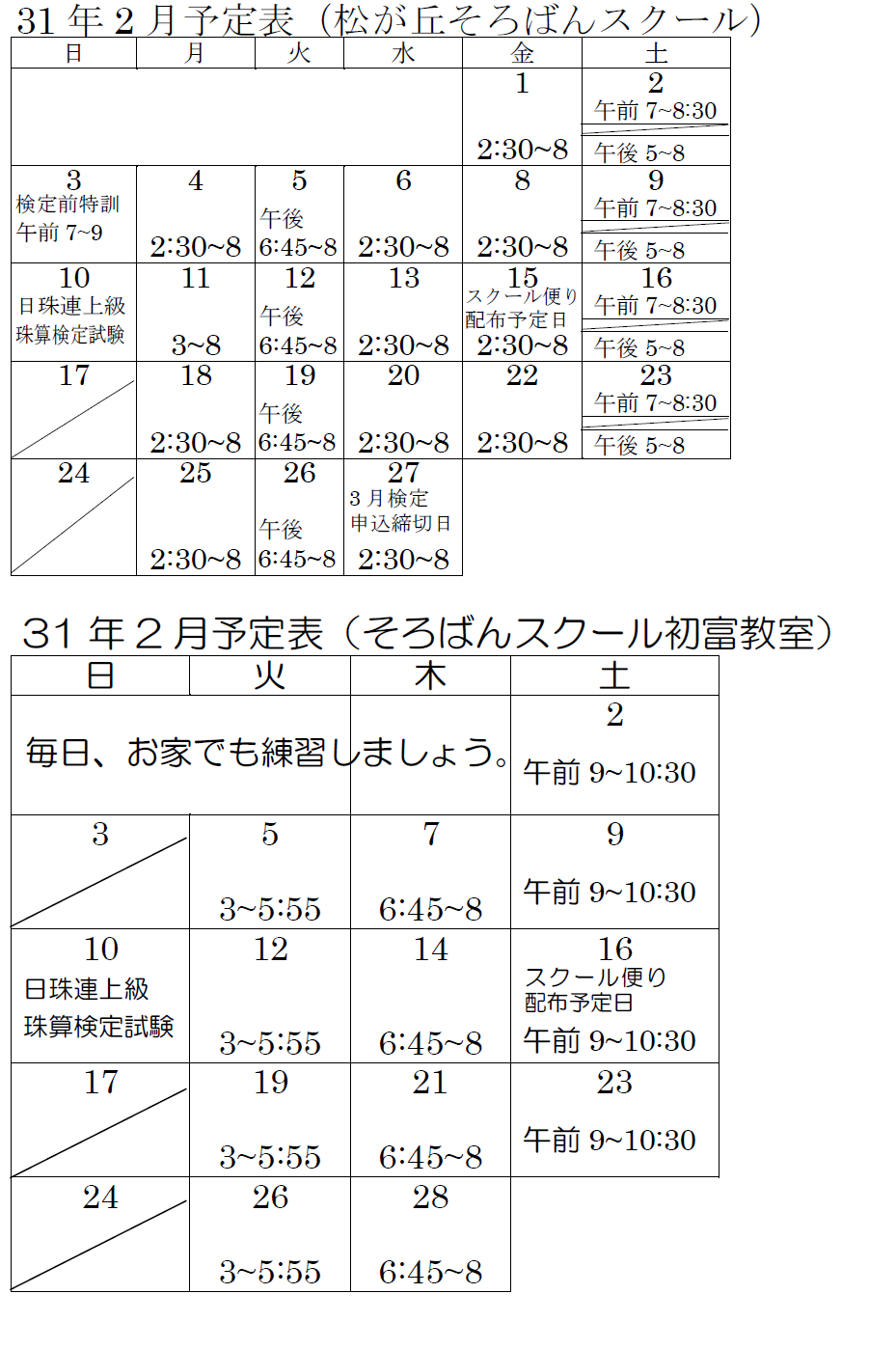 今月の予定表 平成31年2月の予定表 保護者のみなさま、お間違えの無いようにご協力をよろしくお願いいたします。 2025年 2024年 2023年 2022年 2021年 2020年 2019年 2018年 2017年