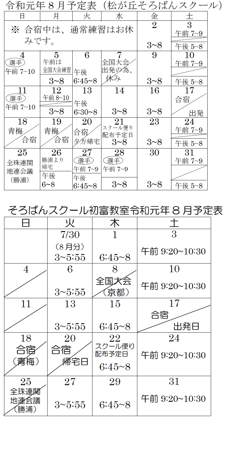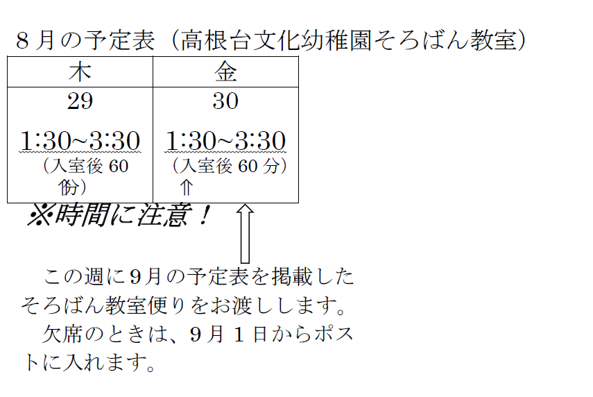 今月の予定表 2019年8月の予定表 保護者のみなさま、お間違えの無いようにご協力をよろしくお願いいたします。 2025年 2024年 2023年 2022年 2021年 2020年 2019年 2018年 2017年
