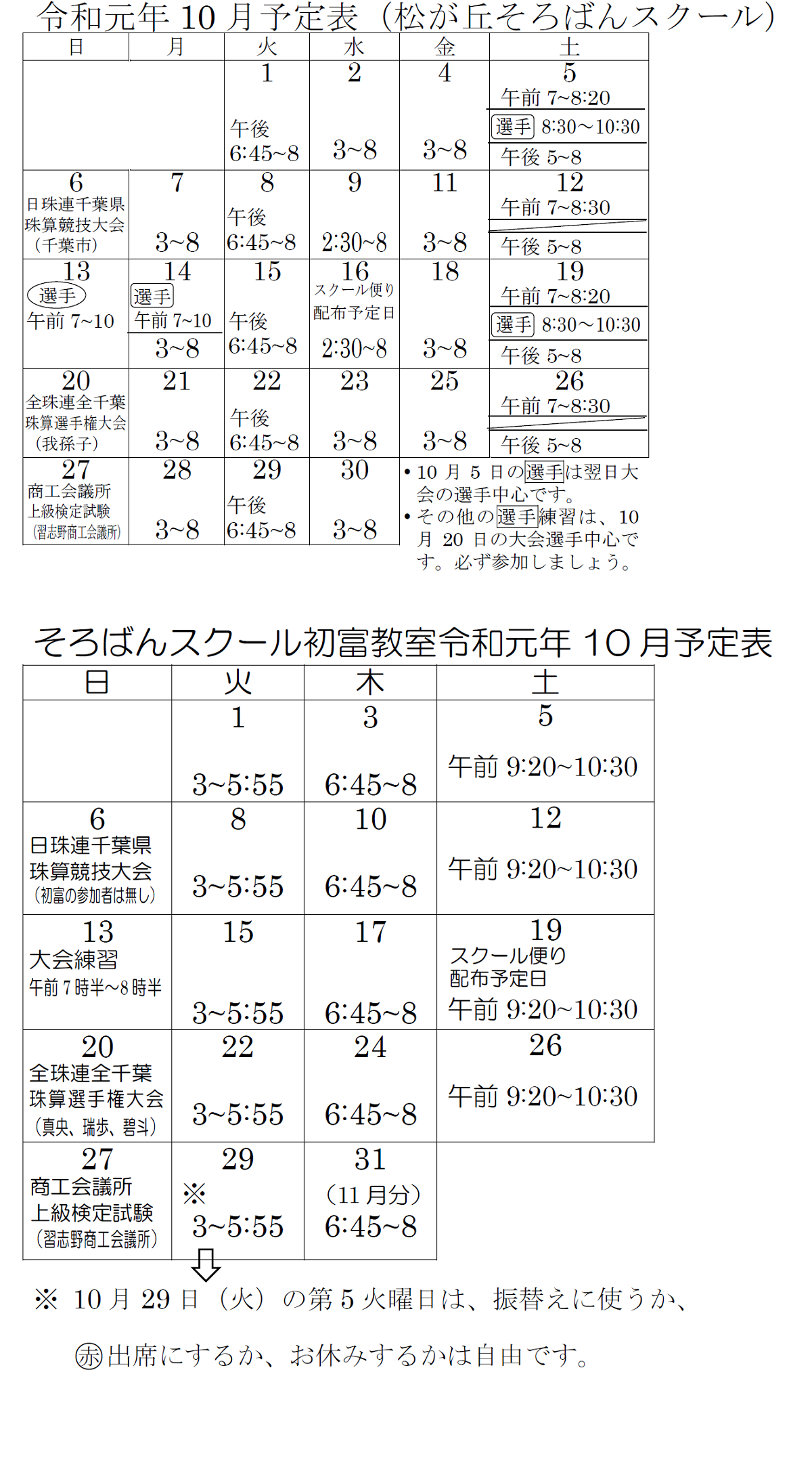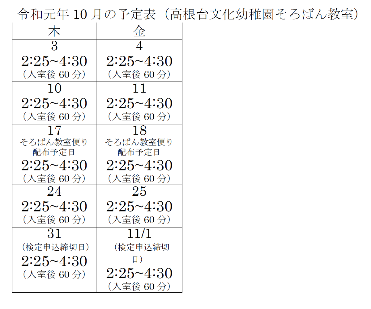 今月の予定表 2019年10月の予定表 保護者のみなさま、お間違えの無いようにご協力をよろしくお願いいたします。 2025年 2024年 2023年 2022年 2021年 2020年 2019年 2018年 2017年