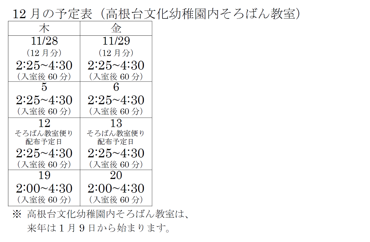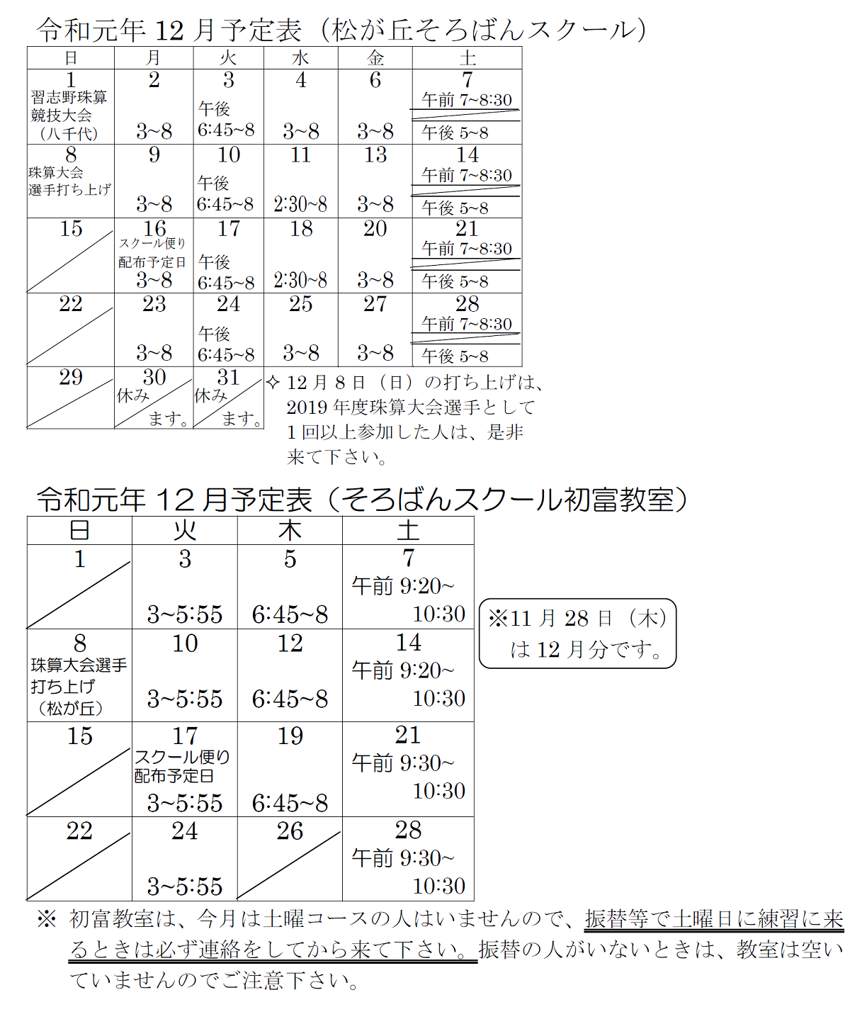 今月の予定表 2019年12月の予定表 保護者のみなさま、お間違えの無いようにご協力をよろしくお願いいたします。 2025年 2024年 2023年 2022年 2021年 2020年 2019年 2018年 2017年