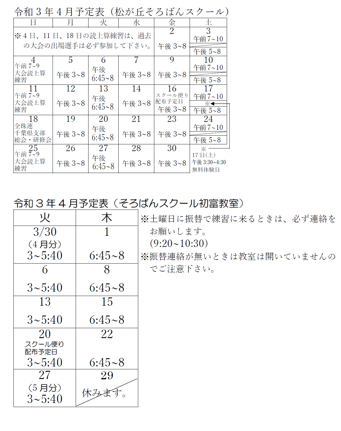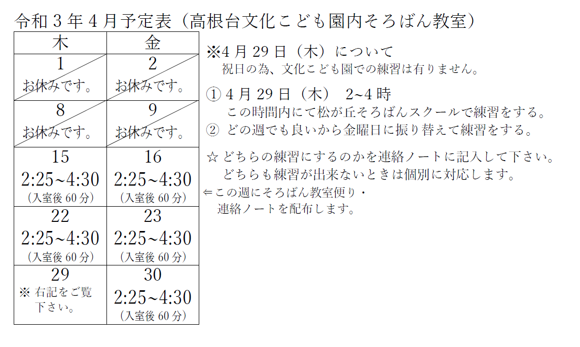今月の予定表 2021年4月の予定表 保護者のみなさま、お間違えの無いようにご協力をよろしくお願いいたします。 2025年 2024年 2023年 2022年 2021年 2020年 2019年 2018年 2017年