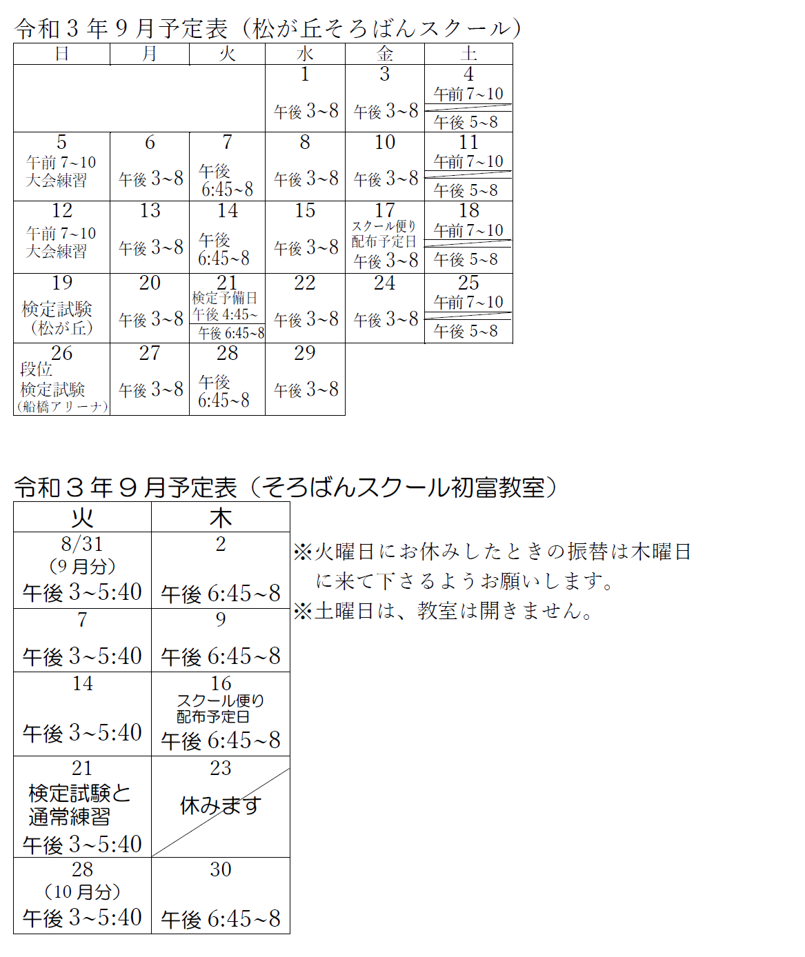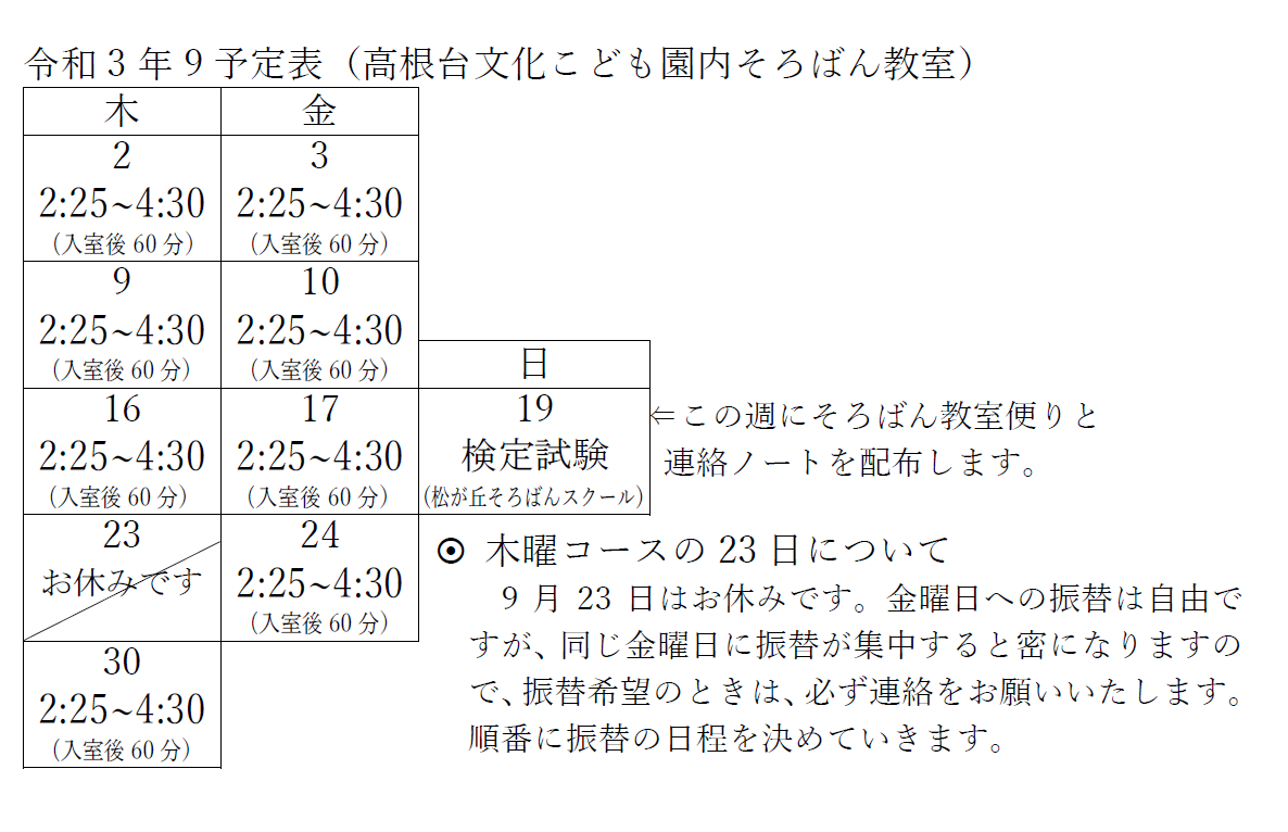 今月の予定表 2021年9月の予定表 保護者のみなさま、お間違えの無いようにご協力をよろしくお願いいたします。 2025年 2024年 2023年 2022年 2021年 2020年 2019年 2018年 2017年
