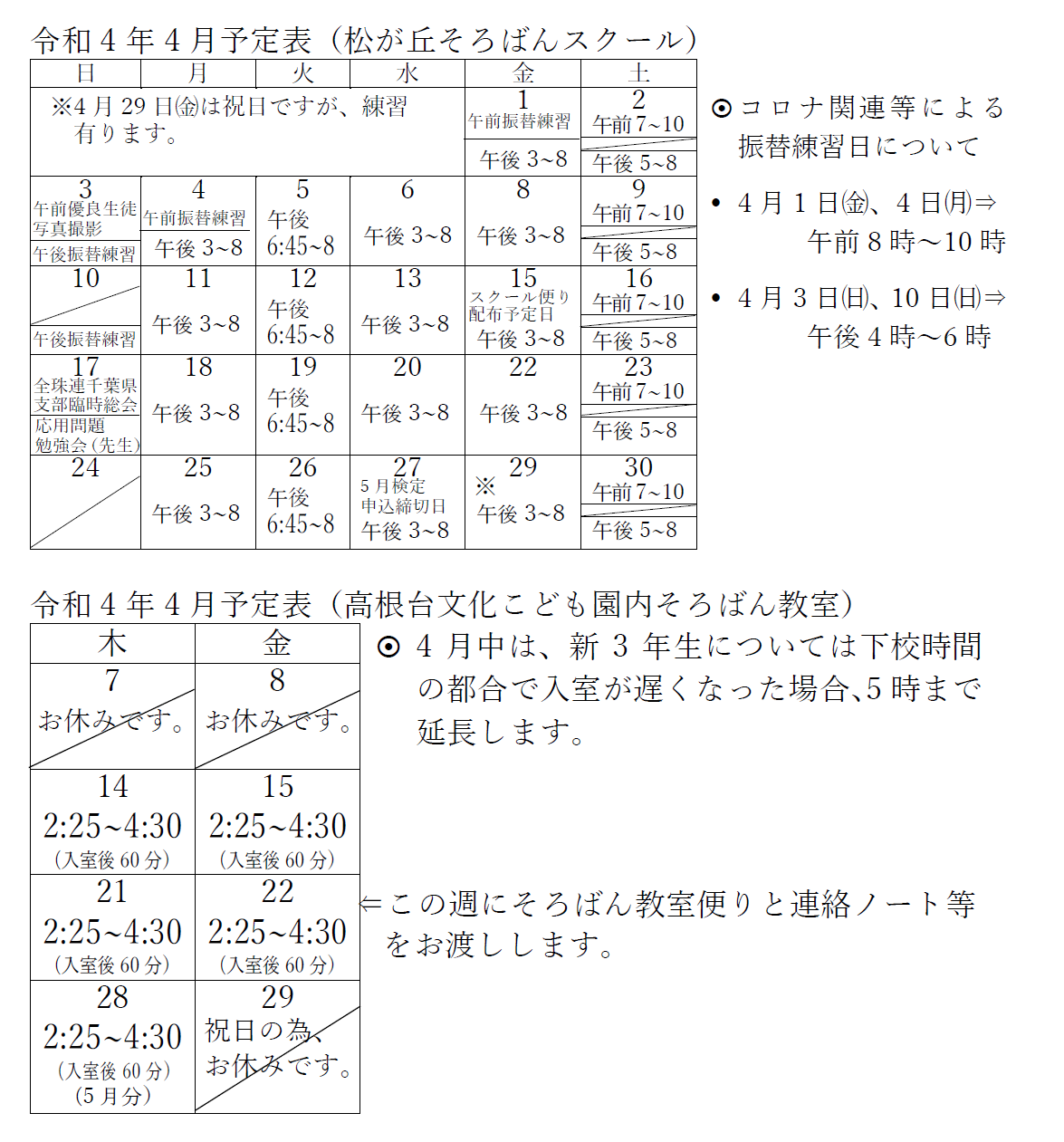 今月の予定表 2022年4月の予定表 保護者のみなさま、お間違えの無いようにご協力をよろしくお願いいたします。 2025年 2024年 2023年 2022年 2021年 2020年 2019年 2018年 2017年