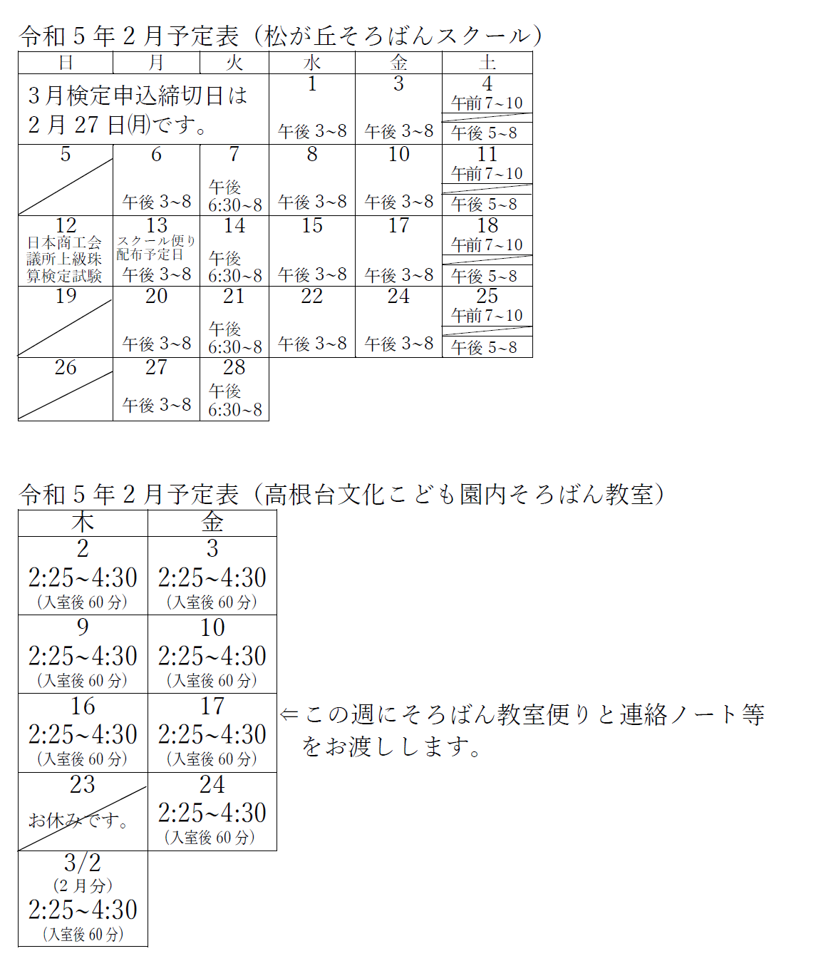 今月の予定表 2023年2月の予定表 保護者のみなさま、お間違えの無いようにご協力をよろしくお願いいたします。 2025年 2024年 2023年 2022年 2021年 2020年 2019年 2018年 2017年