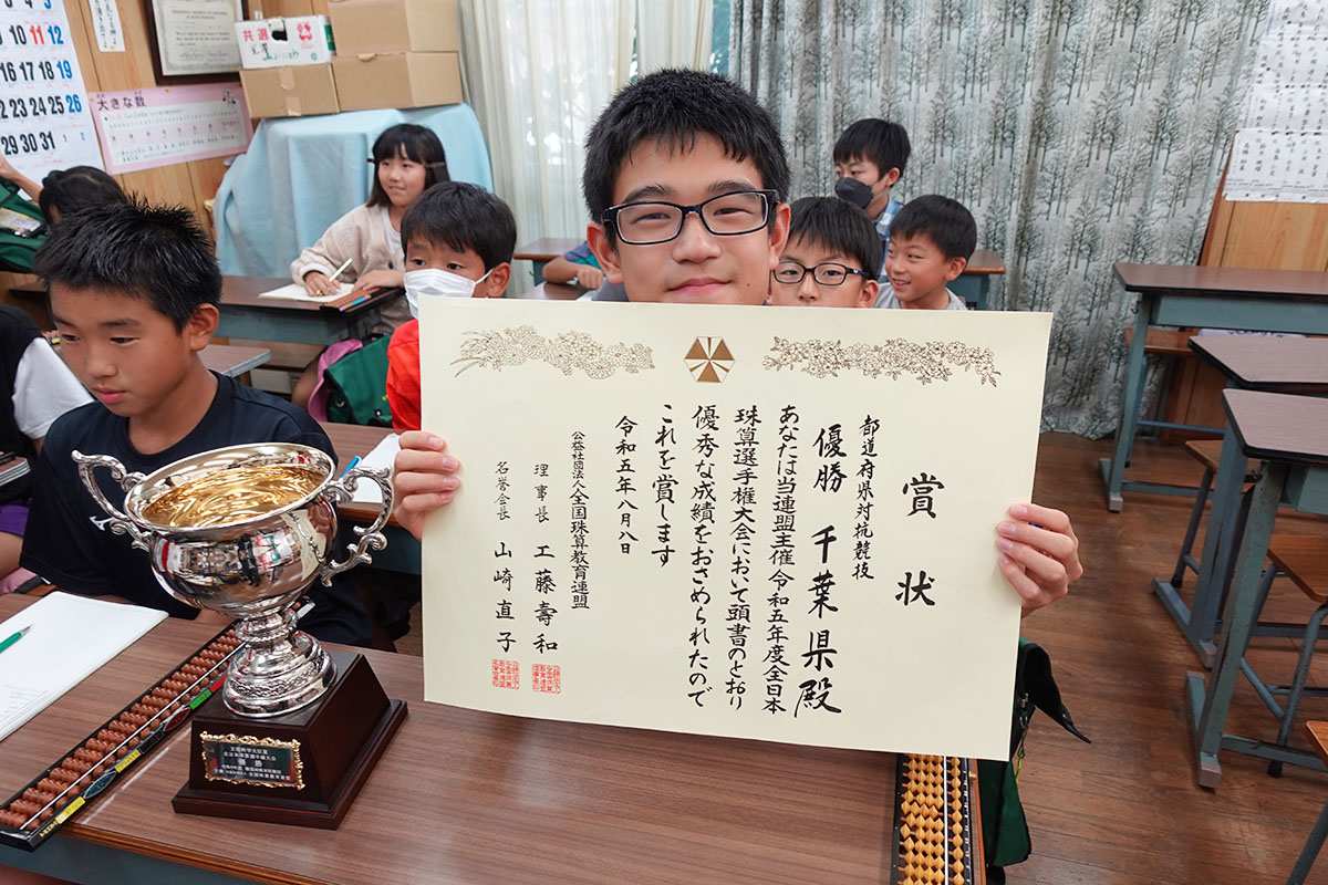 令和5年度全日本珠算選手権大会(令和5年8月8日(火)京都国際会館 主催:全国珠算教育連盟)の都道府県対抗競技(全国各支部から、小学生・中学生・高校一般より各1名ずつ参加する団体戦)において、当教場の益満弓斗君(中3)が千葉県の中学生代表として出場し、決勝戦で愛知県、奈良県と接戦を繰り広げ見事優勝しました。