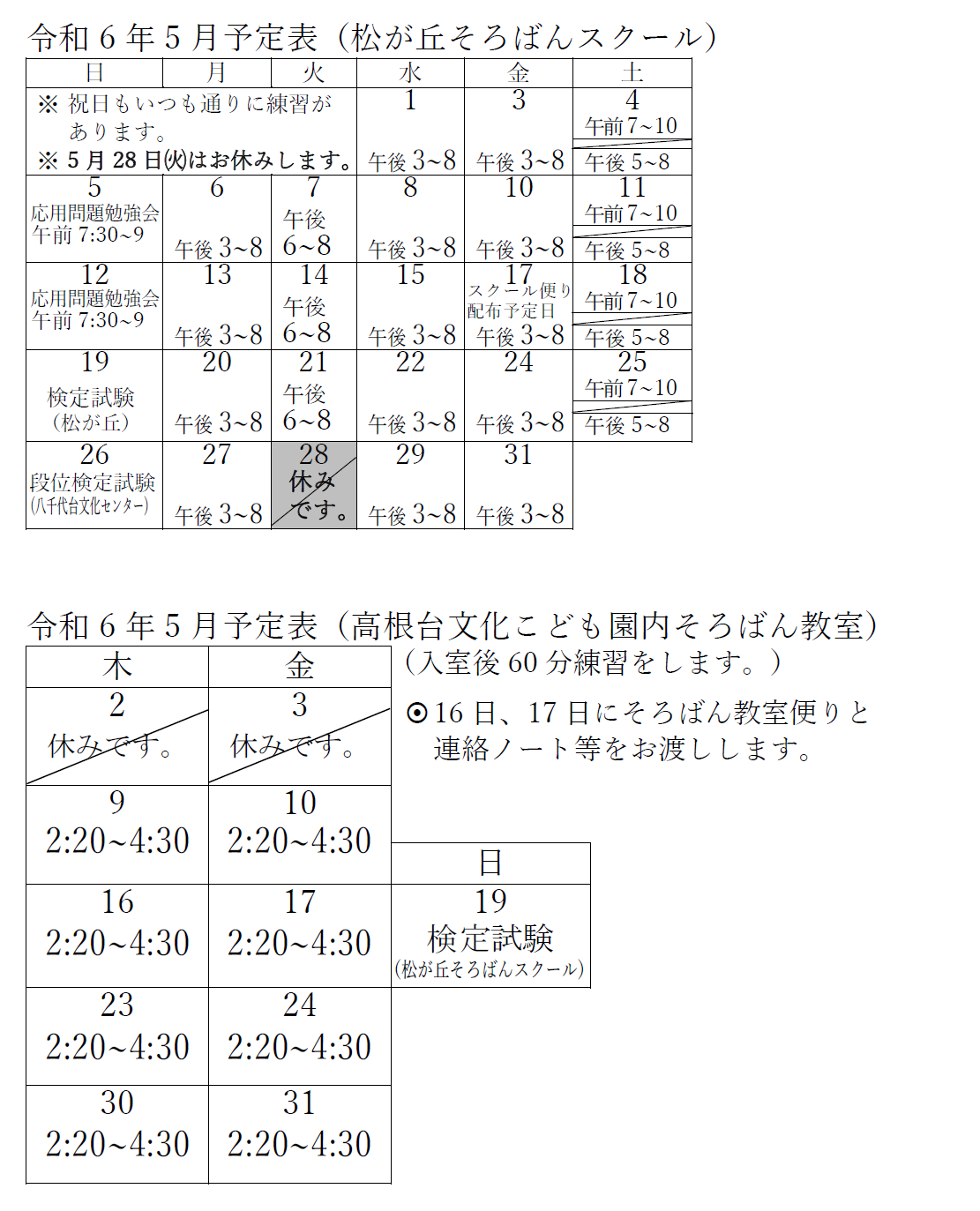 今月の予定表 2024年5月の予定表 保護者のみなさま、お間違えの無いようにご協力をよろしくお願いいたします。 2025年 2024年 2023年 2022年 2021年 2020年 2019年 2018年 2017年