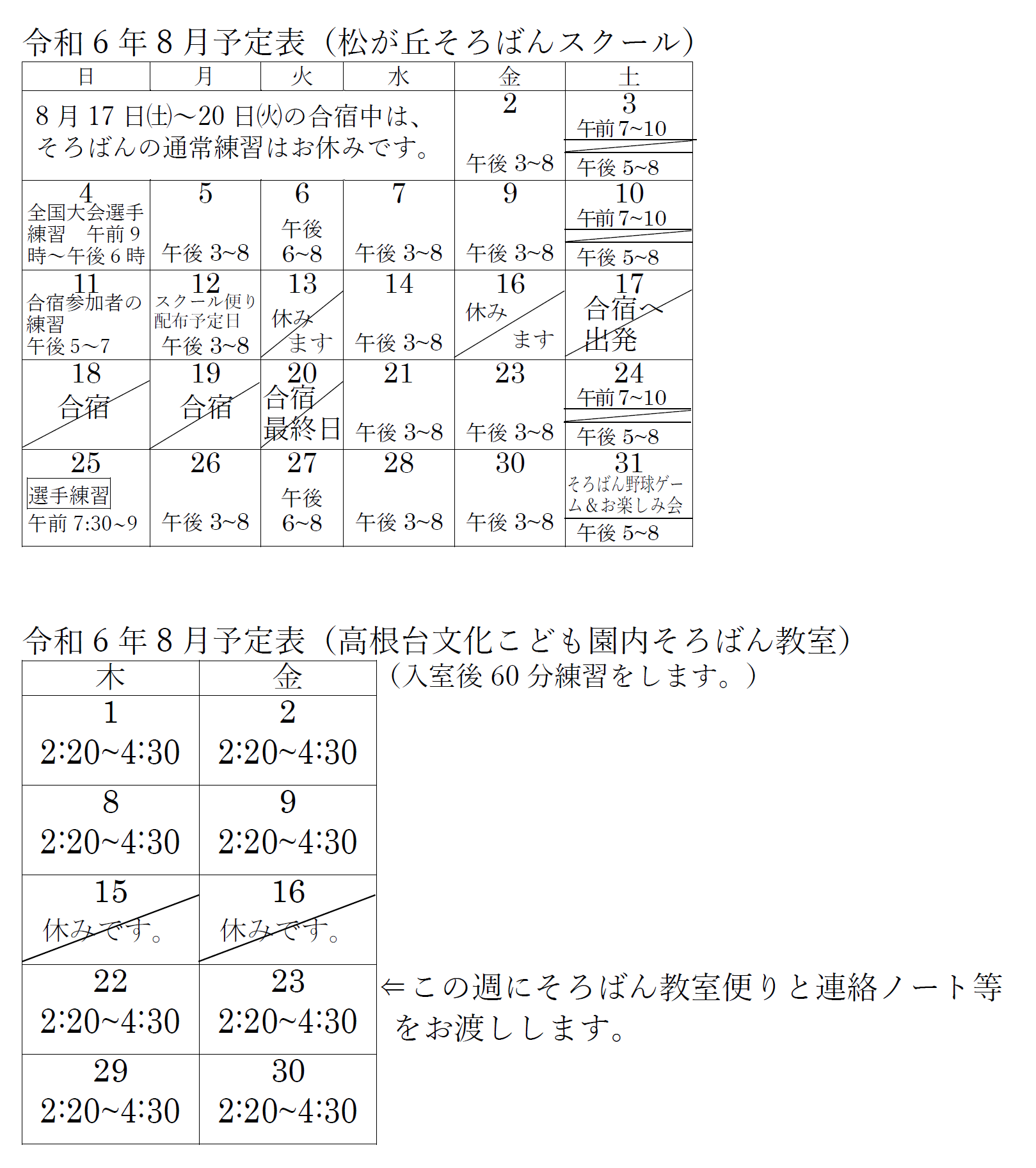 今月の予定表 2024年8月の予定表 保護者のみなさま、お間違えの無いようにご協力をよろしくお願いいたします。 2025年 2024年 2023年 2022年 2021年 2020年 2019年 2018年 2017年