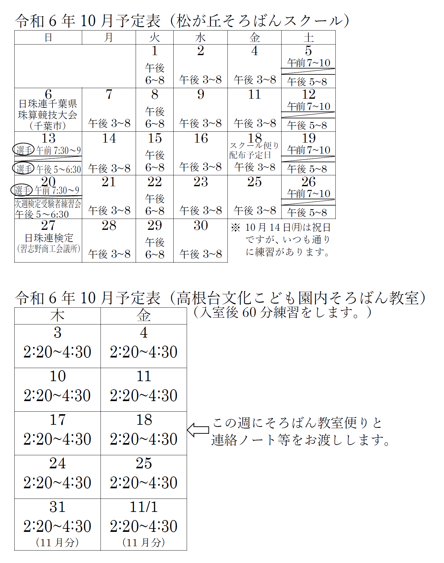 今月の予定表 2024年10月の予定表 保護者のみなさま、お間違えの無いようにご協力をよろしくお願いいたします。 2025年 2024年 2023年 2022年 2021年 2020年 2019年 2018年 2017年