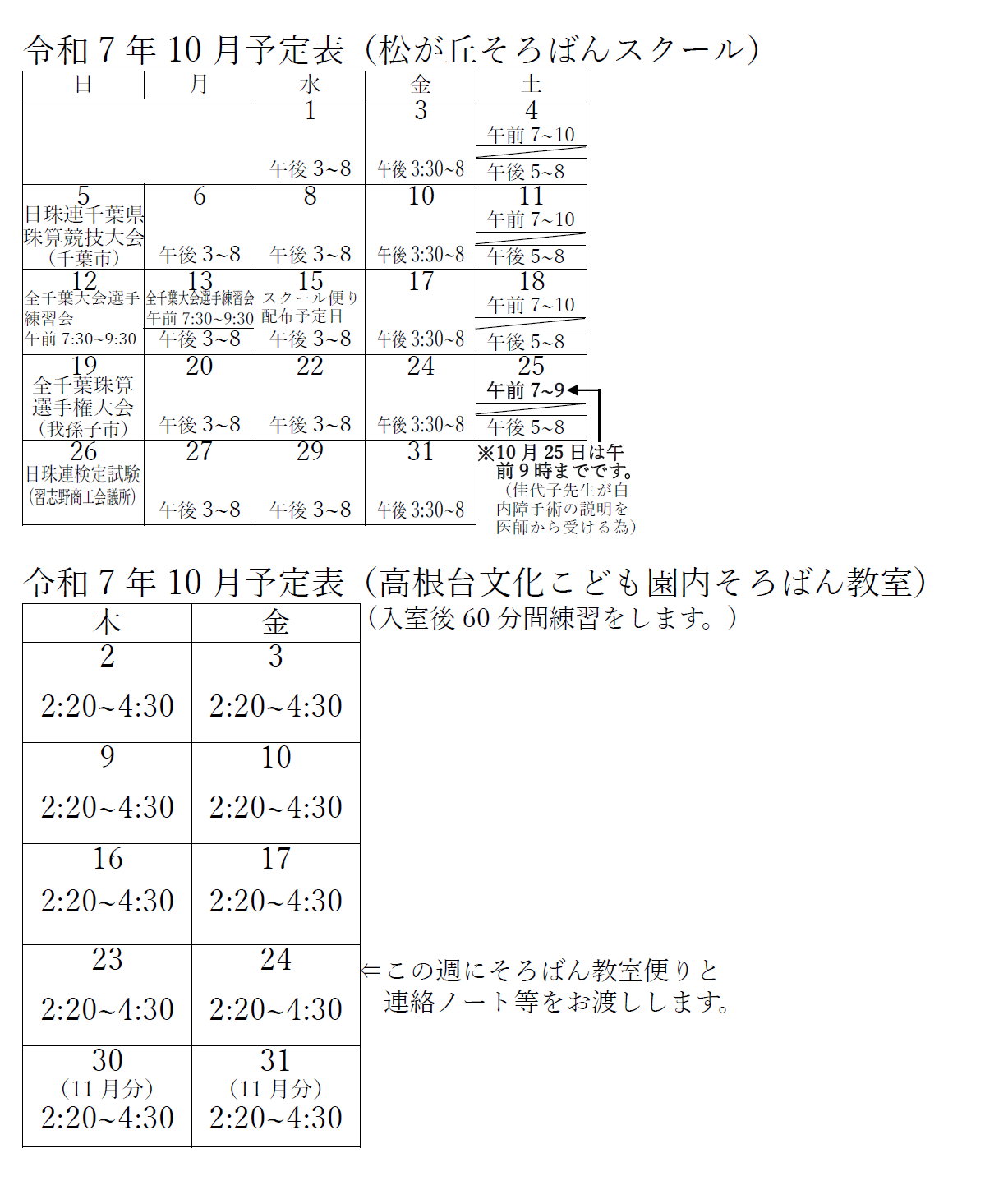 今月の予定表 2025年10月の予定表 保護者のみなさま、お間違えの無いようにご協力をよろしくお願いいたします。 2025年 2024年 2023年 2022年 2021年 2020年 2019年 2018年 2017年
